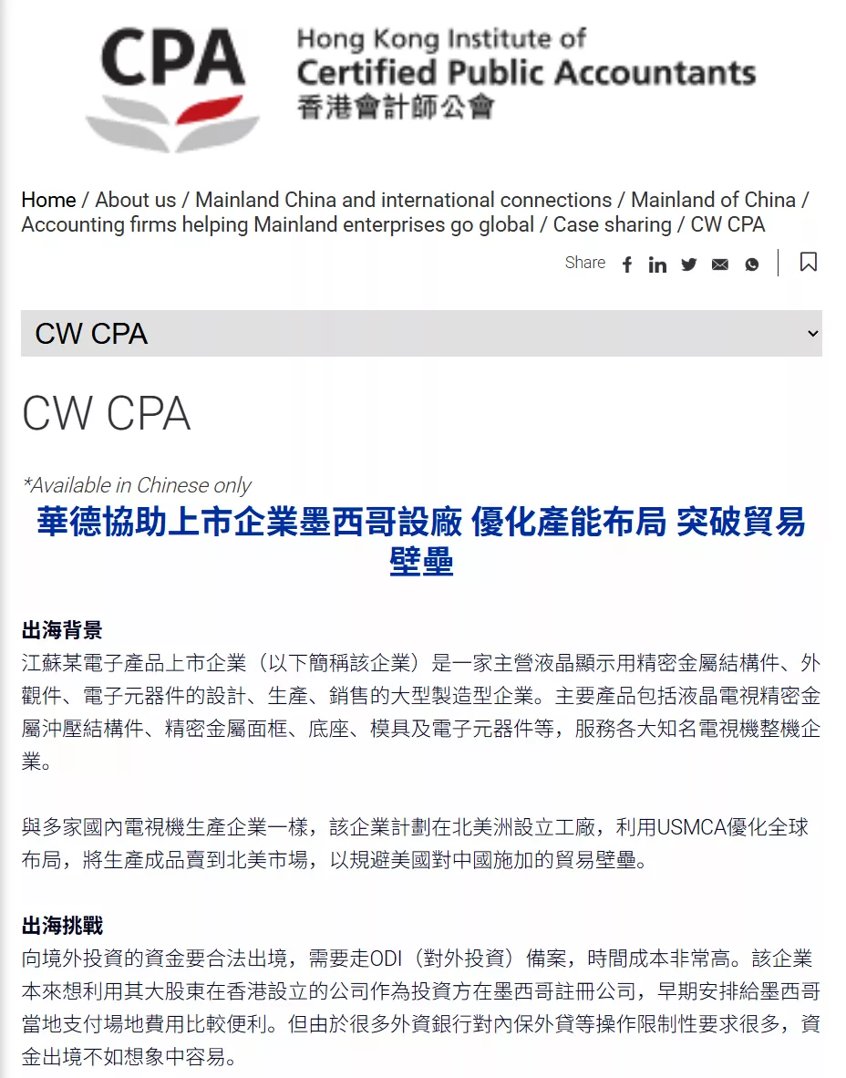 A CW CPA auxiliou uma empresa chinesa listada a estabelecer operações de manufatura no México, apoiando sua expansão estratégica e diversificação da cadeia de suprimentos global. Este caso de sucesso foi destacado pelo Instituto de Contadores Públicos Certificados de Hong Kong (HKICPA) em seu site oficial, como parte de sua série de compartilhamento de casos mostrando como firmas contábeis estão ajudando empresas chinesas continentais a “se globalizarem.”